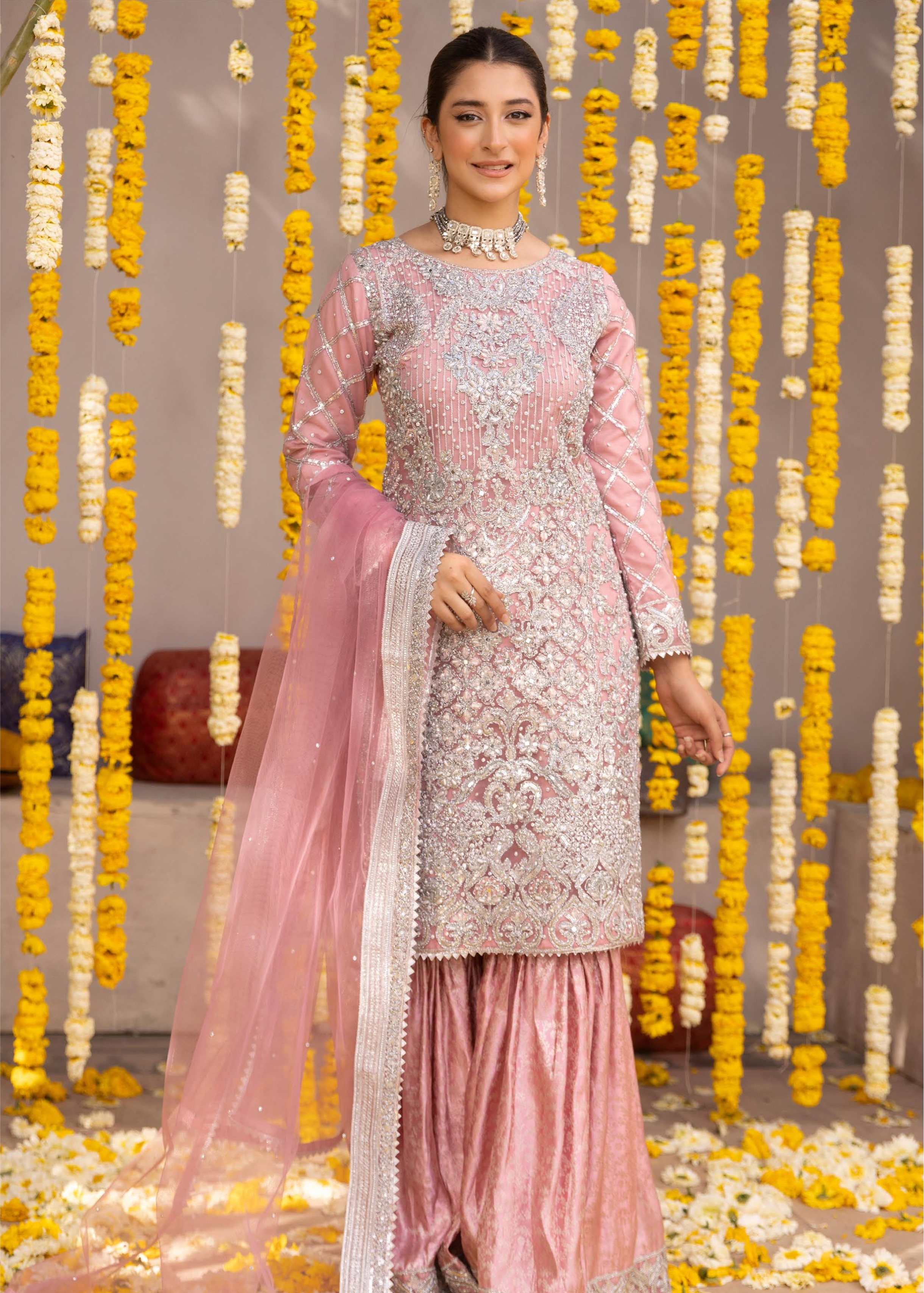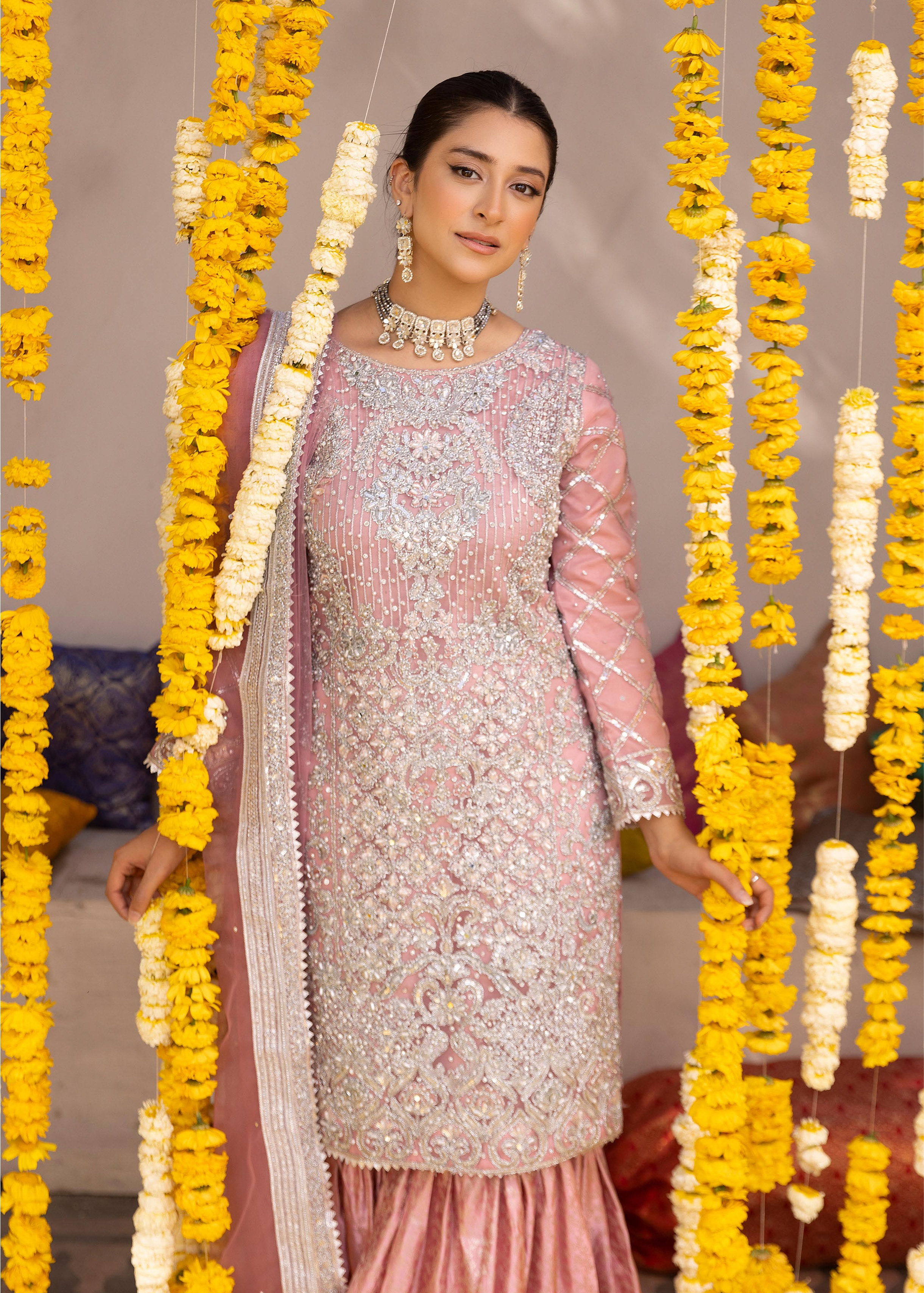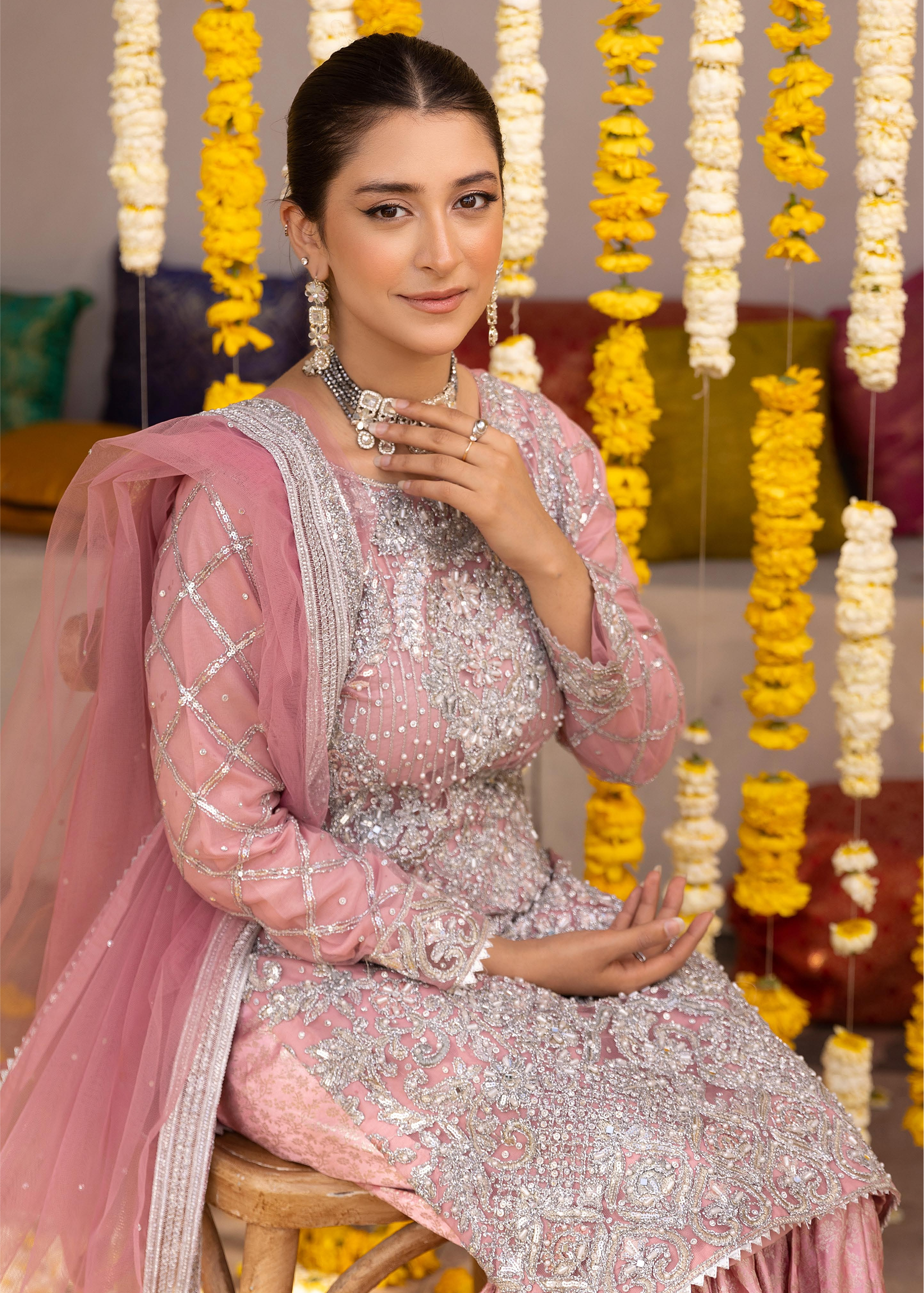 Both outfits feature a delicate baby pink hue adorned with intricate silver embellishments and sequin embroidery that shimmer with every movement. The mother’s outfit includes a beautifully adorned dupatta with lace detailing, while the daughter's dress mirrors the same exquisite design, making for the perfect coordinated look.