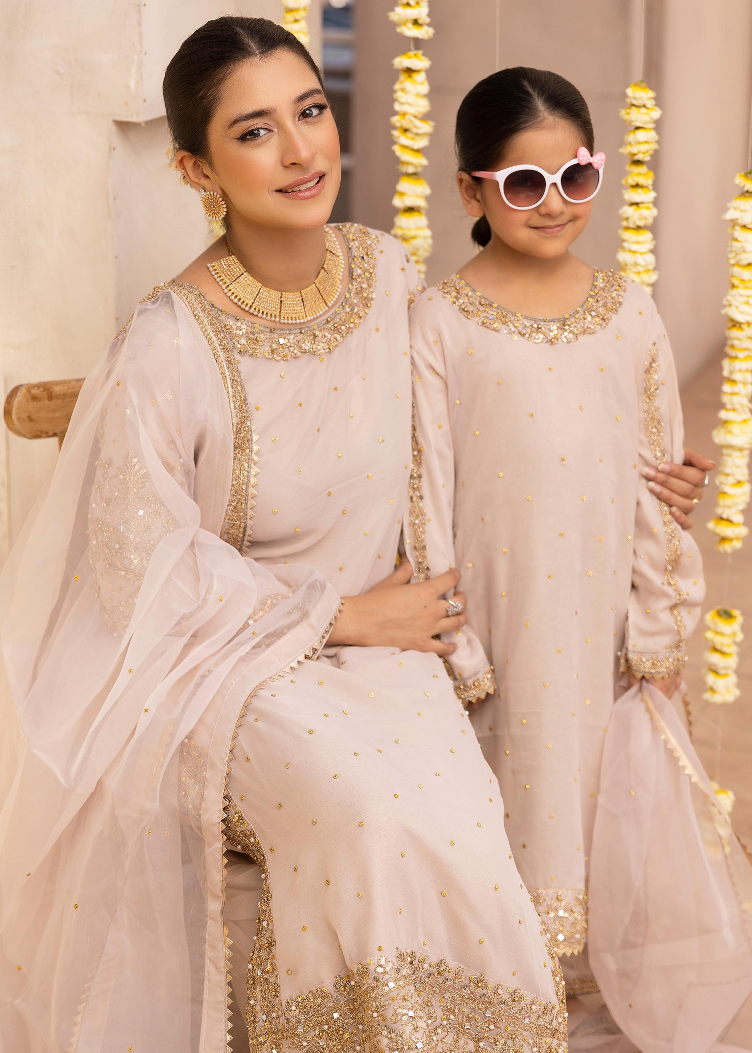 Both outfits feature a delicate baby pink hue adorned with intricate silver embellishments and sequin embroidery that shimmer with every movement. The mother’s outfit includes a beautifully adorned dupatta with lace detailing, while the daughter's dress mirrors the same exquisite design, making for the perfect coordinated look.